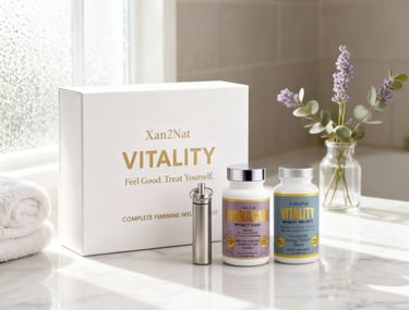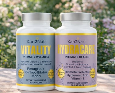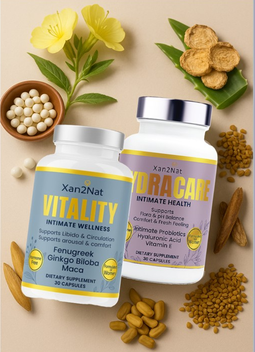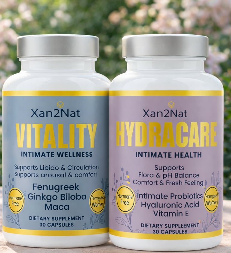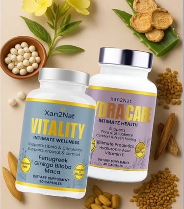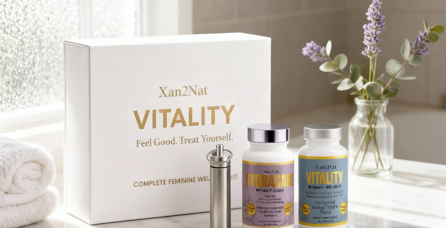 Reclaim your intimate wellness with the dual-system Xan2Nat™ Vitality + HydraCare. This premium, hormone-free kit supports natural lubrication, vaginal pH balance, flora health, odor control, libido, and daily comfort.